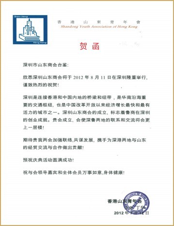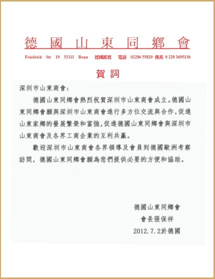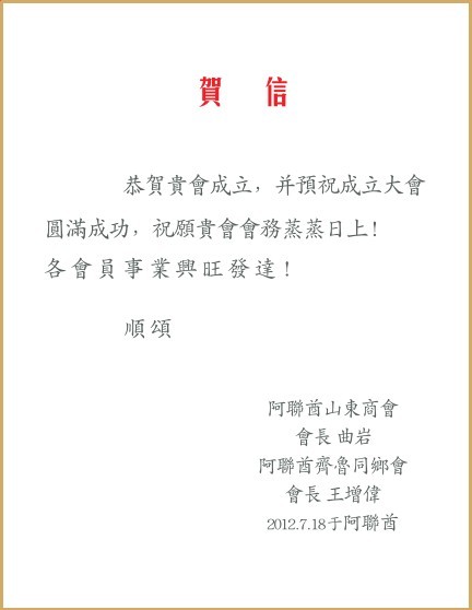 德國山東同鄉(xiāng)會賀信 阿聯(lián)酋山東商會暨齊魯同鄉(xiāng)會賀信
