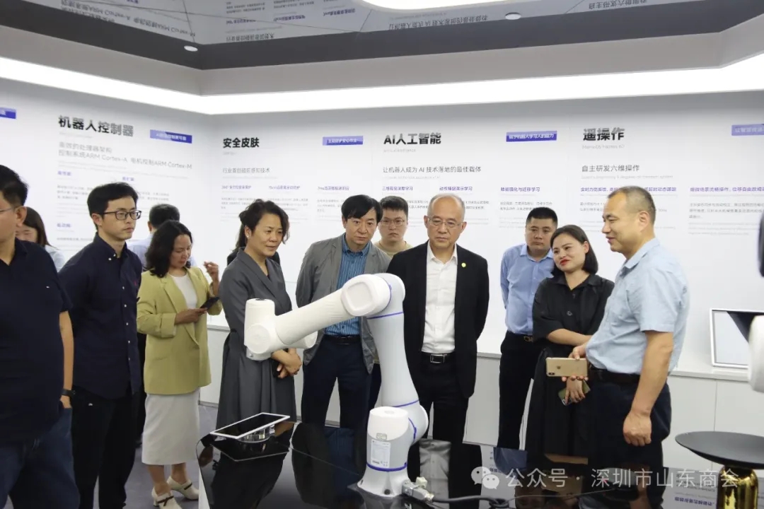 南山區(qū)委統(tǒng)戰(zhàn)部副部長、區(qū)工商聯(lián)黨組書記樂麗華,南山區(qū)工商聯(lián)專職副主席肖曉青,南山區(qū)人大代表、深圳市山東商會會長王立新,南山區(qū)人大常委、深圳市山東商會執(zhí)行會長、粵海商會會長張煥祥,深圳市山東商會副會長、越疆科技創(chuàng)始人、董事長劉培超,深圳市山東商會副會長遠明、王占貴以及山東大學深圳研究院院長周慶華等領導以及騰訊云科技、招商銀行、招商證券、上海銀行、郵儲銀行、深創(chuàng)投、深產(chǎn)園促會、北大科創(chuàng)園等知名創(chuàng)投機構、科研院所、高科技企業(yè)負責人60余人出席活動。本次活動由粵海商會秘書長蔣輝主持。 活動伊始,與會嘉賓在越疆科技工作人員的帶領下,參觀了越疆科技的展廳,深入了解越疆科技在機器人、智能制造等領域的最新研發(fā)成果和應用場景。越疆科技作為全球領先的智能機械臂解決方案提供商,展示了其在工業(yè)自動化、教育、醫(yī)療等多個領域的創(chuàng)新產(chǎn)品和技術。