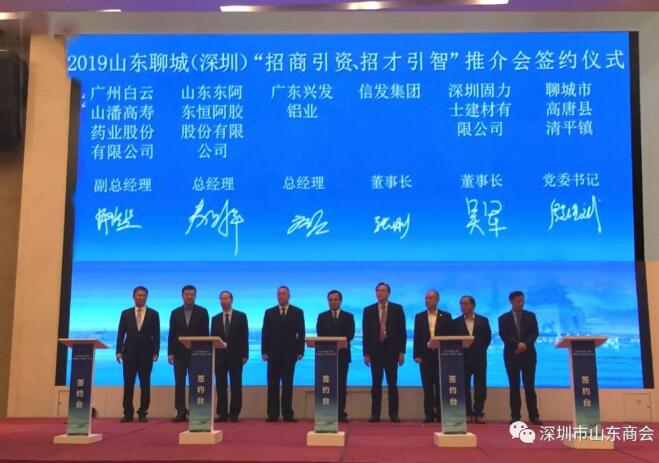 推介會由聊城市副市長馬麗紅主持。聊城市委副書記、市長宋軍繼致辭。會上播放了聊城市產(chǎn)業(yè)推介宣傳片,推介聊城新舊動能轉(zhuǎn)換重點項目,并舉行項目簽約儀式。此次合作項目中我會理事單位深圳市固力士建材有限公司董事長吳軍與聊城市高唐縣清平鎮(zhèn)達成合作項目,簽署協(xié)議。深圳市山東商會王立新會長上臺見證簽約。