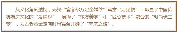 2016年9月深圳國際珠寶展,“賽菲爾大美中國風(fēng)萬足金婚紗”一經(jīng)亮相就轟動全場,吸引了近千家媒體頭條報道。僅僅一次微信直播,就有六萬觀眾在線觀看。對此,王卓引以為豪地說:“賽菲爾萬足金婚紗讓古老的黃金重新煥發(fā)出了時尚活力,引領(lǐng)黃金進(jìn)入無焊料時代。”