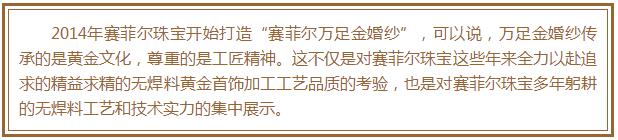 沿著這條思路,賽菲爾珠寶開啟了一場聚焦明確、聲勢浩大的營銷戰(zhàn)役。實踐證明,“無焊料黃金”的純度更高、更保值、更有價值,再加上賽菲爾珠寶精湛的工藝,很快地“賽菲爾無焊料黃金”暢銷全國市場,受到消費者的追捧。