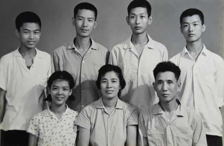1960年代,張勛甫一家人合影,前排右為父親張勛甫,前排中為母親盧佩,前排左為女兒張小玲,后排為四個(gè)兒子,后排左一為張曉建。