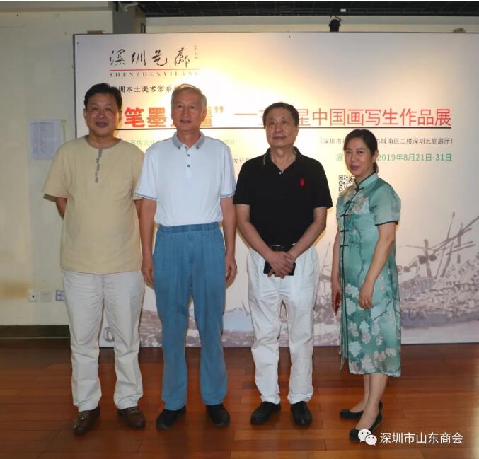 深圳市山東商會會長王立新(左一)、深圳出版發(fā)行集團黨委書記尹昌龍(右一)與深圳市齊魯書畫院院長王維星合影