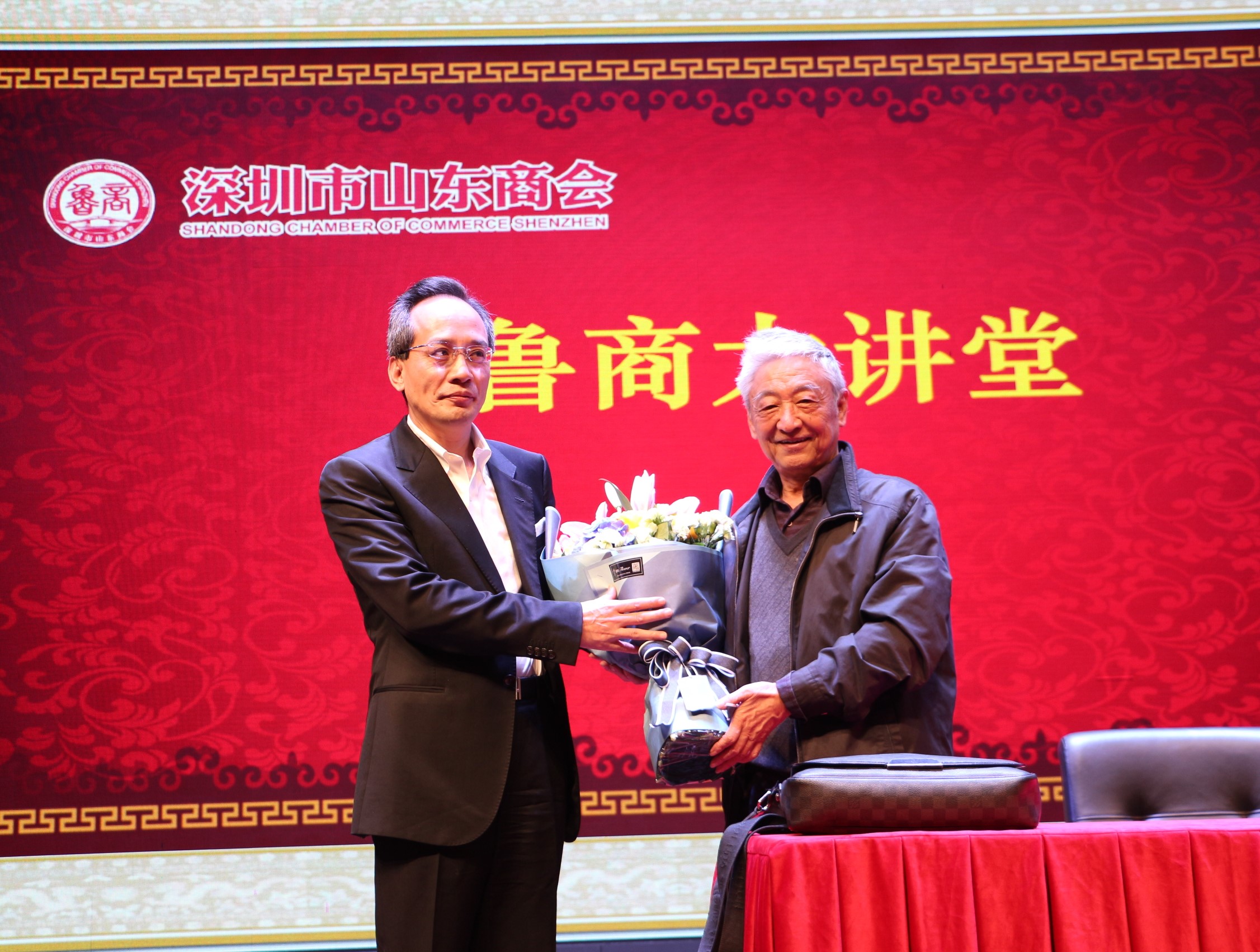常務(wù)副會(huì)長(zhǎng)兼秘書(shū)長(zhǎng)王維贈(zèng)送章必功教授鮮花祝賀魯商大講堂圓滿(mǎn)成功