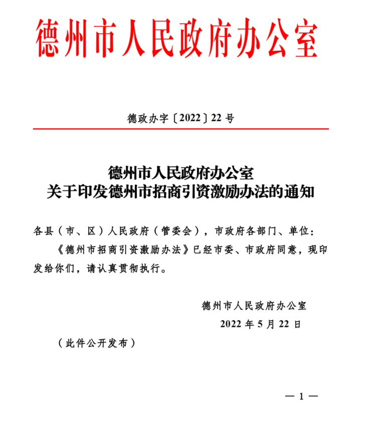 德州市人民政府辦公室關(guān)于印發(fā)德州市招商引資激勵(lì)辦法的通知