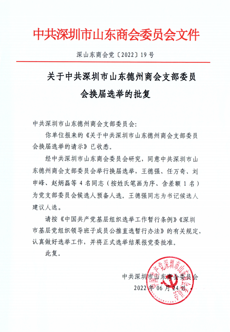 會(huì)議由上一屆支部書記王德強(qiáng)同志主持。大會(huì)第一項(xiàng),趙炳磊同志宣讀《關(guān)于中共深圳市山東德州商會(huì)支部委員會(huì)換屆選舉的批復(fù)》。