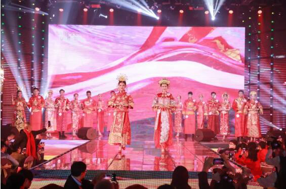 盛典上,一場(chǎng)10分鐘的萬(wàn)足金婚紗秀令人驚艷贊嘆,賽菲爾珠寶歷年共計(jì)18套萬(wàn)足金婚紗齊亮相。伴隨著悅動(dòng)的音符,18位男女模特身披華彩熠熠的絕美婚紗及男士唐裝結(jié)婚禮服,在如夢(mèng)似幻的燈光中緩緩入場(chǎng),將全場(chǎng)氣氛點(diǎn)燃。