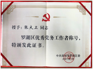 在中國共產(chǎn)黨迎接百年華誕之際,中共深圳羅湖藍海村鎮(zhèn)銀行支部委員會書記張大衛(wèi)同志被羅湖區(qū)授予“優(yōu)秀黨務(wù)工作者”稱號,中共深圳羅湖藍海村鎮(zhèn)銀行支部委員會被授予“羅湖區(qū)先進基層黨組織”稱號。